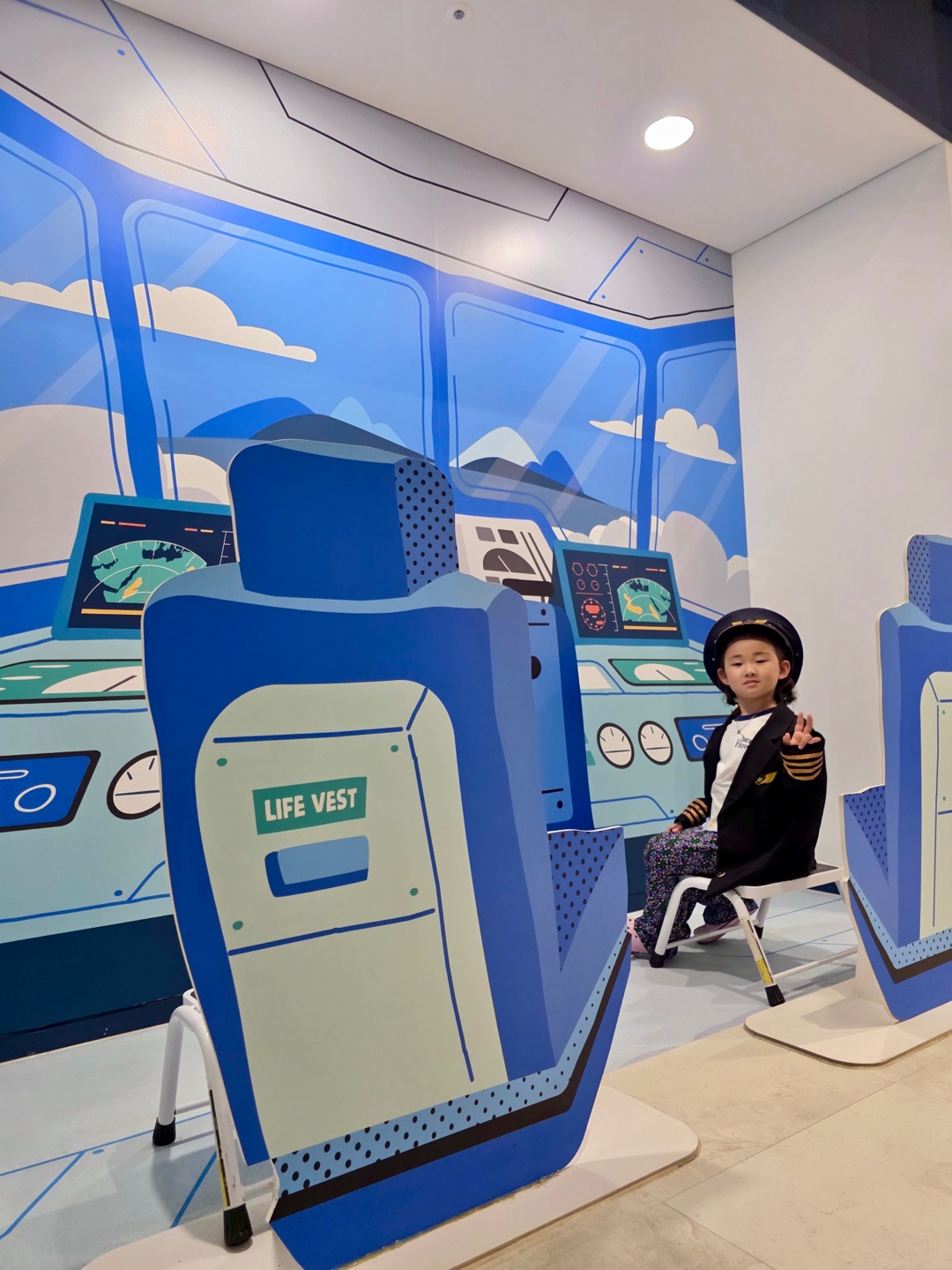 2층에는 코스튬 옷이 있어서 아이들이 승무원이나 조송사 옷을 입고 사진 촬영을 할수 있게 되어있었어요. 외에 기내 안전체험과 다양한 VR체험등이 있어서 아이들이 좋아하는 거를 다 모아둔 느낌이었어요.